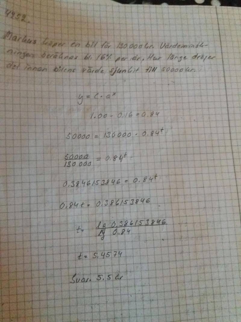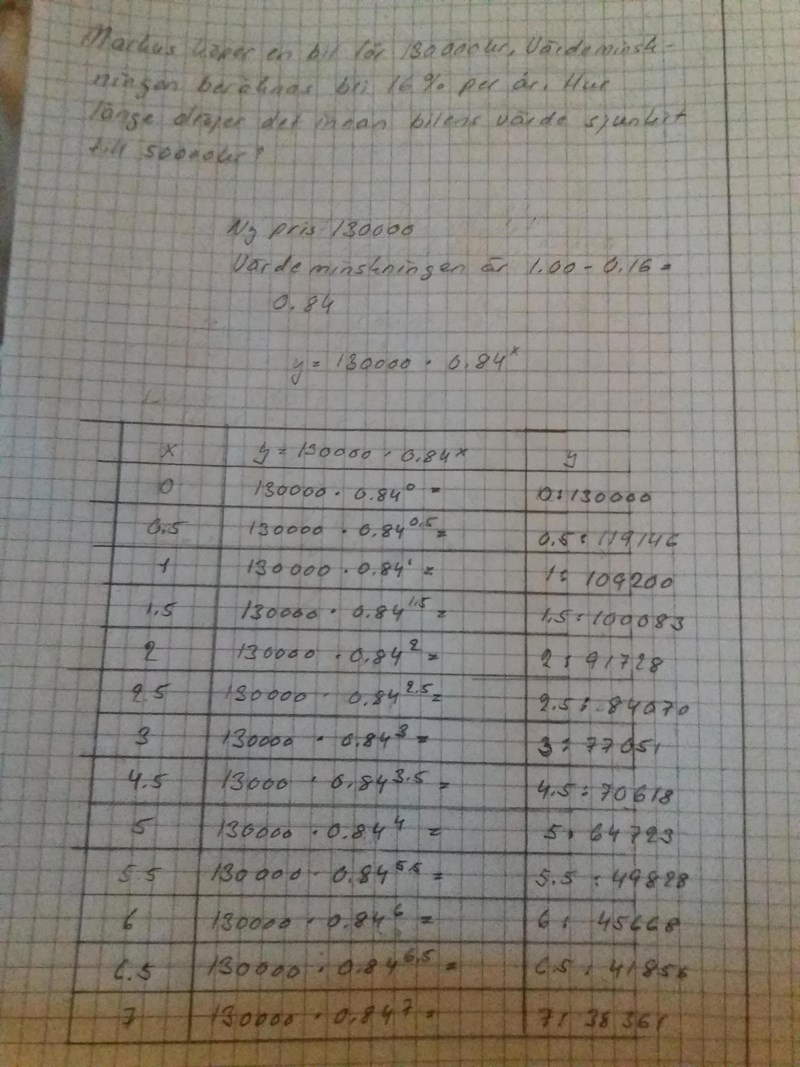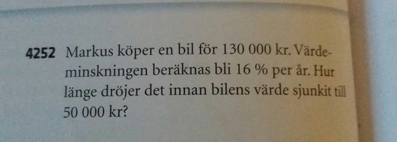 Edit: Efter du har lagt in bilden så ser jag att du redan har gjort det. Frågar lyder efter hur lång tid är bilen värd . Dvs du vill lösa ekvationen