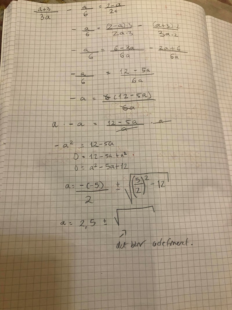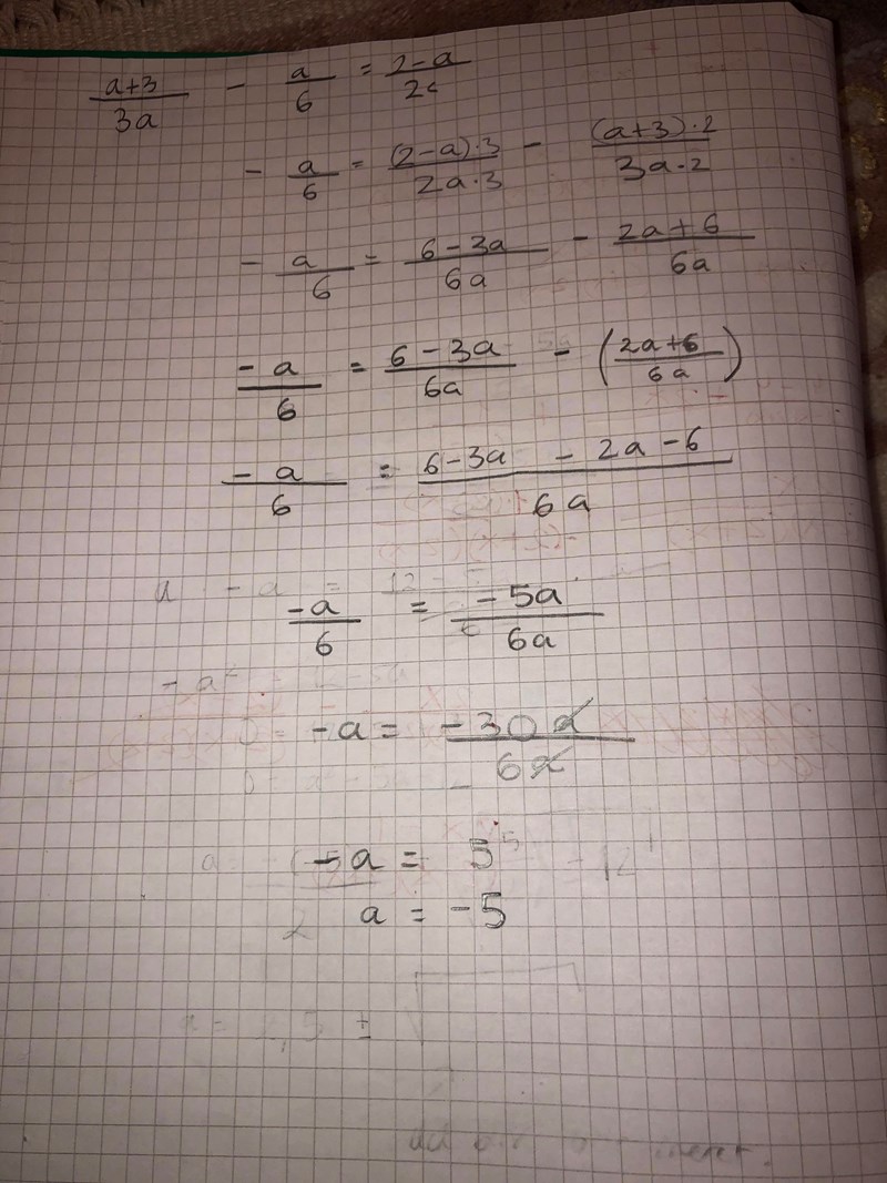 På tredje raden har du i princip 6-3a-(2a+6), för att det är två separata bråk, men du räknar som om det var 6-3a-2a+6.