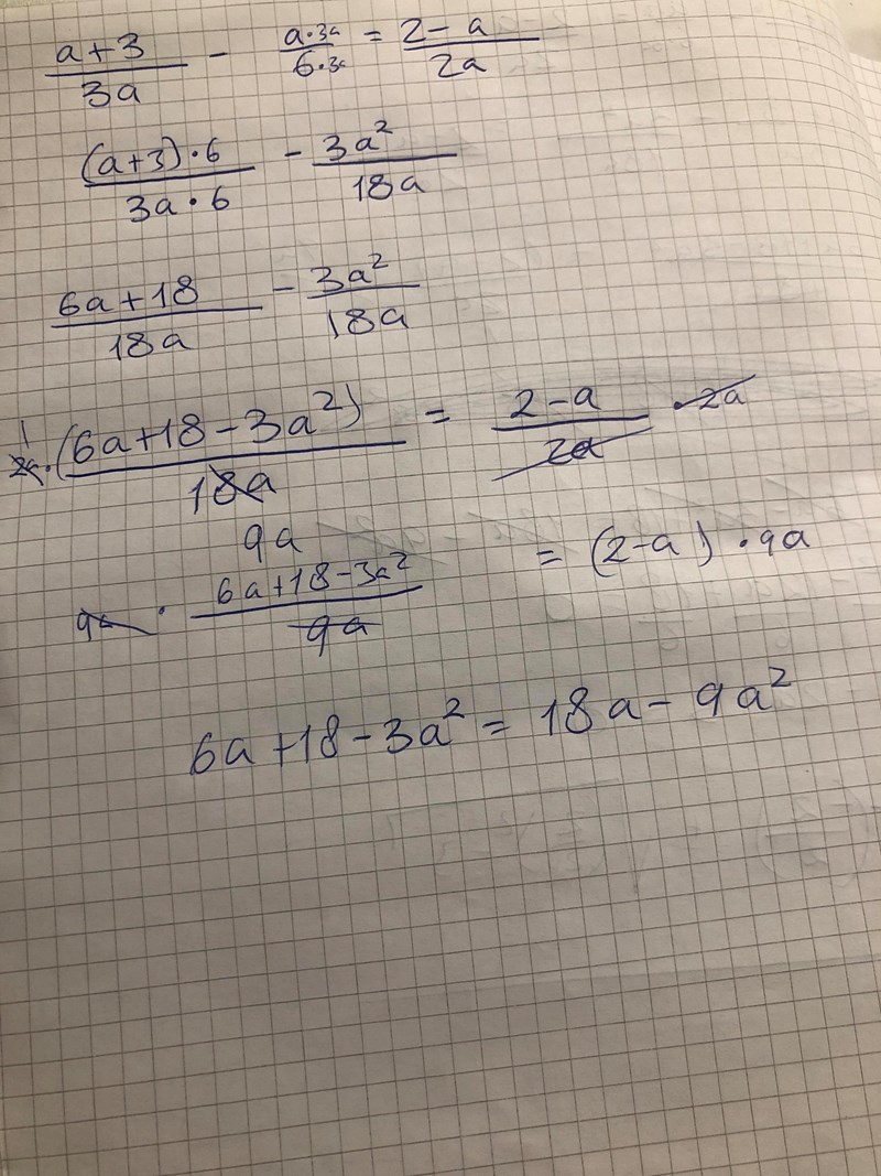 6a+1818a-3a218a=2-a2a.\frac{6a+18}{18a}-\frac{3a^2}{18a} = \frac{2-a}{2a}.