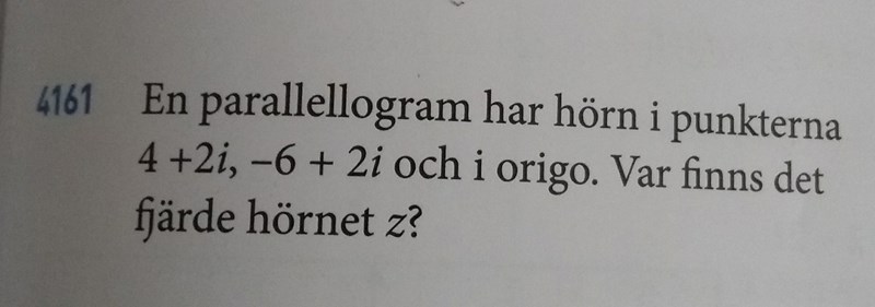 Jag har bara kunnat komma fram till att avståndet mellan 4+2i och -6+2i är 10. Vilket är rätt enligt facit men jag har svårt att komma fram till den fjärde punkten? Vad blir dess koordinater?