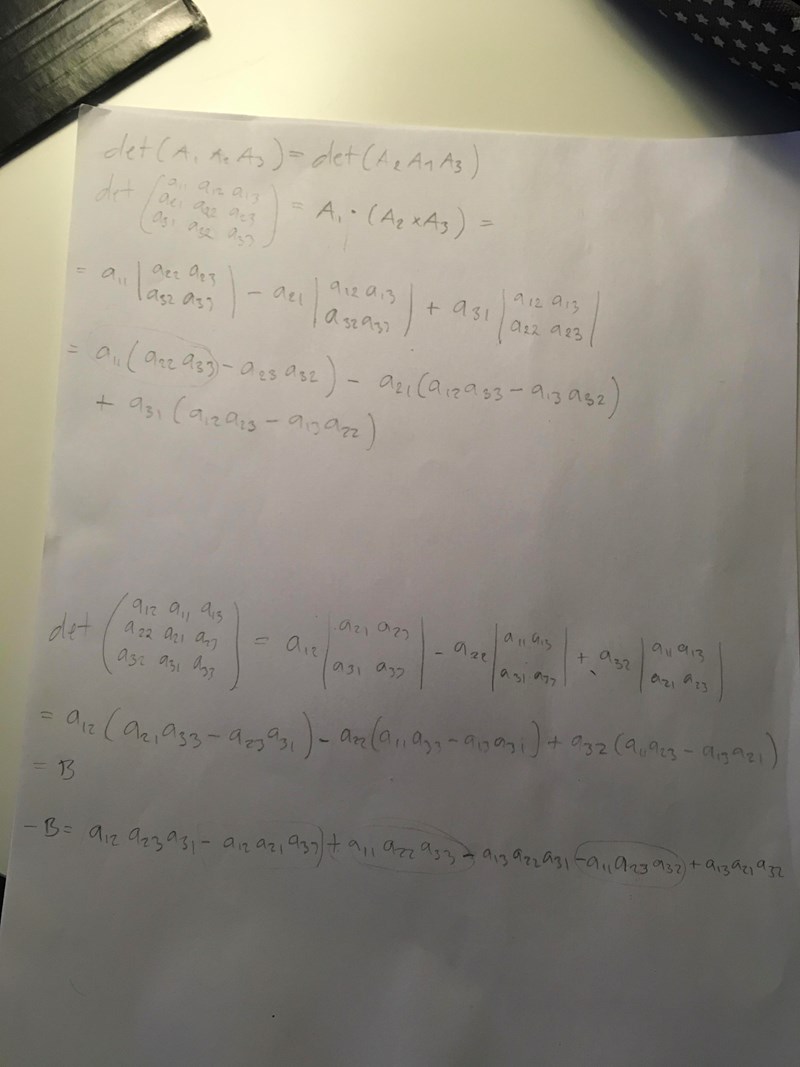 Mina tankar: Trippelprodukten ger mig arean av en parallelletriped, kolonnenerna kan representera en av de tre vektorerna som bygger upp p-pipeden. HL i påståendet kan uttryckas; A1 • (A2 x A3) = A’1 • (A2 x A3) = |A’1||A2 x A3| och VL = A2 • (A1 x A3) = ... = |A’2||A1 x A3|. Det verkar som att det handlar om att man pågrund av kryssprodukten får ut den negativa vektorn vid denna omöblering i högerled, och för att kompensera multiplicerar med (-1).