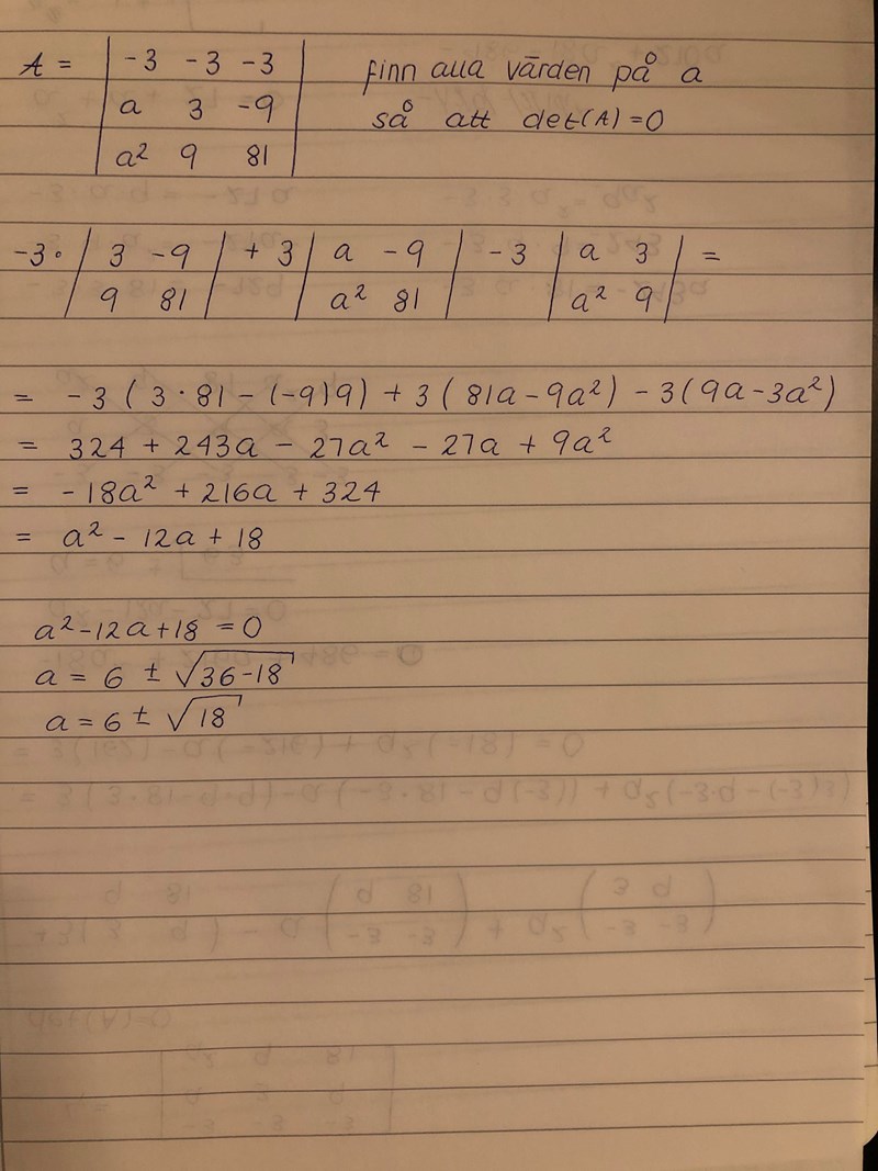 Jag söker det(A)=0 och har gjort uträkningen enligt nedan men får ett felaktigt svar.