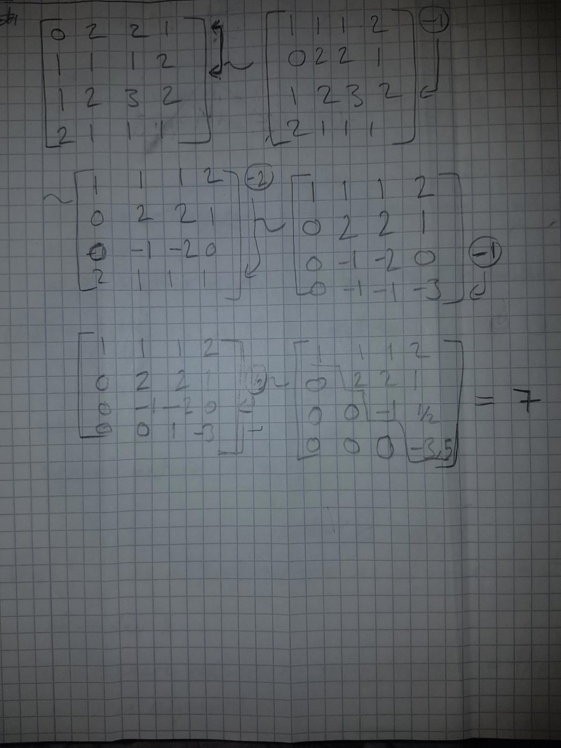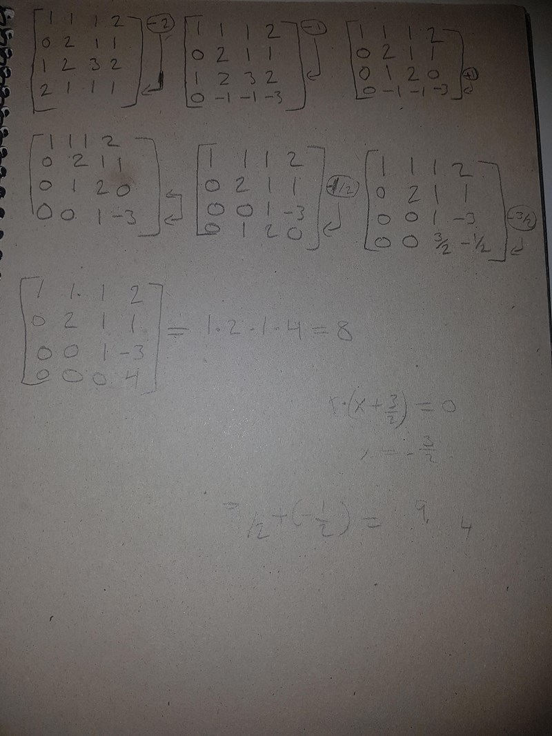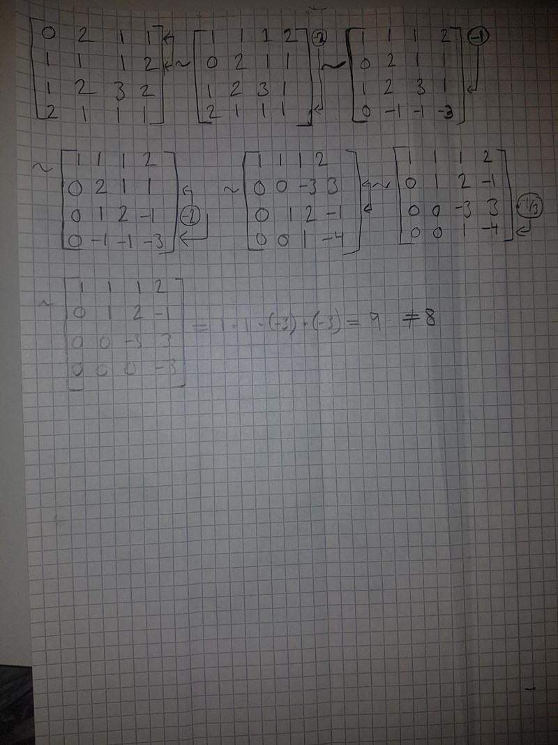 Jag ska räkna ut determinanten av denna matris. Svaret är 8. Jag har fått det till 7 och 9...