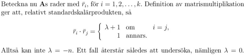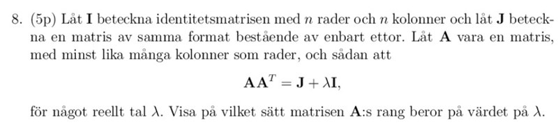 Jag har nästan lyckats lösa problemet. Jag lyckades komma fram till att om lambda är 0 så gäller att rangen är 1, och att om lambda är skilt från 0 så fås att rangen är maximal. Dock förstår jag inte sedan hur facit motiverar när de säger att lambda inte kan vara -n.