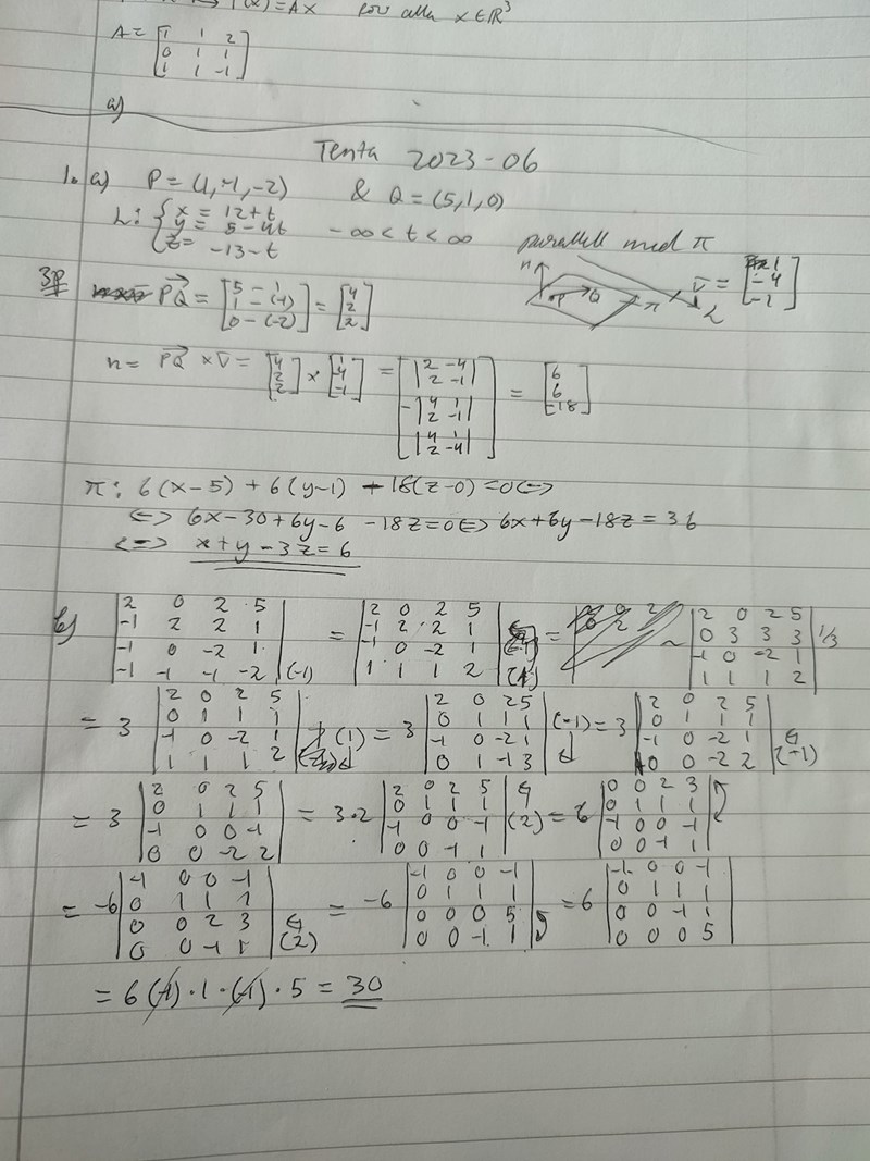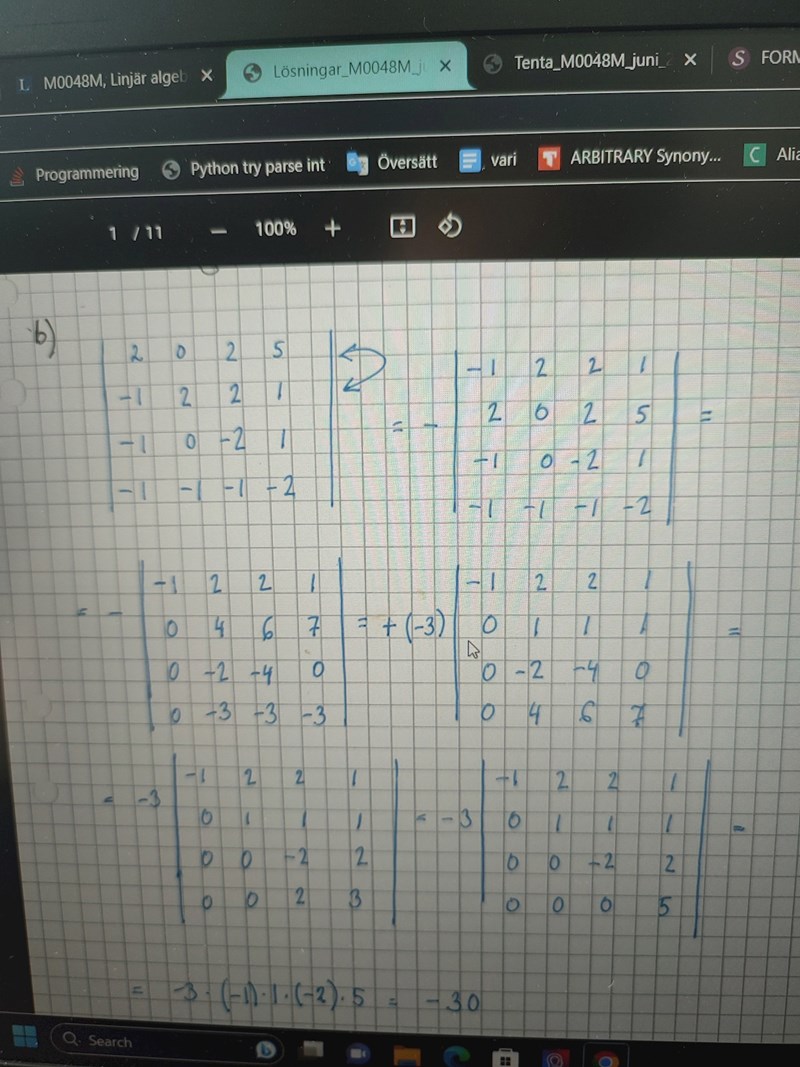 Hej! Jag försöker lösa denna fråga (1b) där jag ska beräkna determinanten men fick 30 medan facit fick -30. Vi har gjort lite olika radoperationer så det är svårt att se var det blev fel någonstans, har dubbelkollat mina beräkningar men får det fortfarande till 30, vet inte var det blir fel?:(