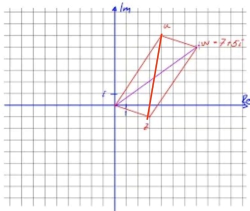 Talen 0, u= 4+6i,  z = 3-i och w= z+u ligger i ett komplext talplan. Beräkna längden av parallelogrammens diagonaler.
