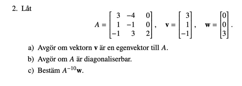 Jag har generellt väldigt svårt att lösa uppgifter som i fråga B, där frågan är "avgör om matrisen är diagonaliserbar. Jag vet att steg 1 är att hitta egenvärden/egenvektorer, men med varje uppgift blir uträkningen för determinanten väldigt lång och klumpig. Jag förstår inte hur jag ska beräkna determinanten på ett enkelt sätt så att det blir rätt. Jag bifogar min uträkning, det enda jag får fram är en lång ekvation som jag inte får fram egenvärdena på. vad är det jag gör fel/kan förbättra för att pricksäkert kunna lösa liknande uppgifter? (Edit: jag ser att jag räknade fel i sista systemet -6+8=2, så utöver det tycker jag allt bör stämma)