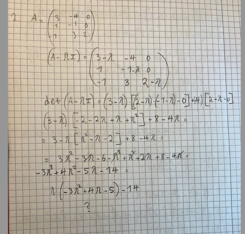 Men isåfall blir ekvationen väl -λ3+4λ2-5λ+2. Men efter detta vet jag inte vad jag ska göra för att få fram egenvärdena. Ekvationen kan faktoriseras genom att bryta ut lambda så λ (-λ2+4λ-5)+2. Men jag vet ändå inte hur jag ska göra efter det