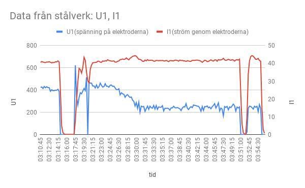 Mellan 03:14:45 och 03:17:30 händer något med elektriciteten i ljusbågsugnen. Beskriv detta i ett diagram och ge några förslag på vad som kan ha hänt.