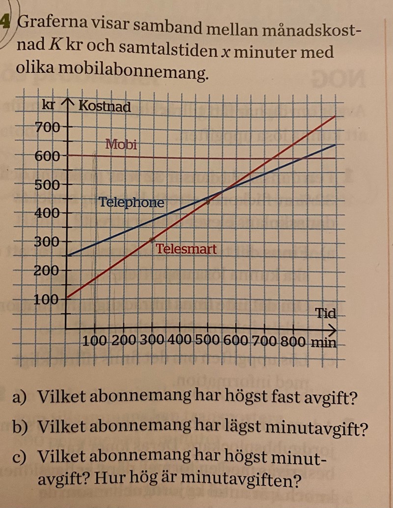 Smaragdalena skrev:De här tre telefonabonnemangen har en fast avgift (100, 250 respektive 600 kr) och en rörlig del. För Mobi är den rörliga delen 0, de båda andra har rörlig kostnad så linjerna lutar uppåt.