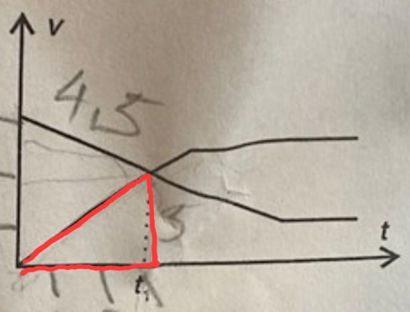 Att den ena bilen hinner ifatt den andra. Jag fattar inte vad det har med sträckan att göra. Att en bil hinner ifatt en annan, betyder det inte att hastigheten i den ena bilen är större än hos den andra som vi ser är sant efter t1?