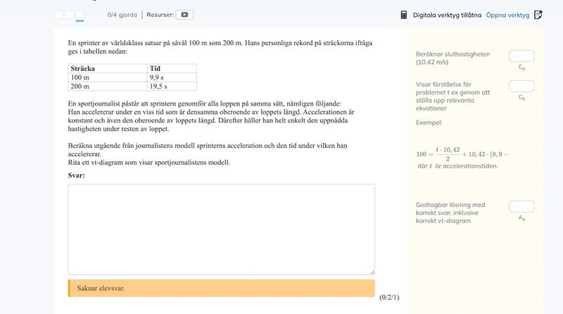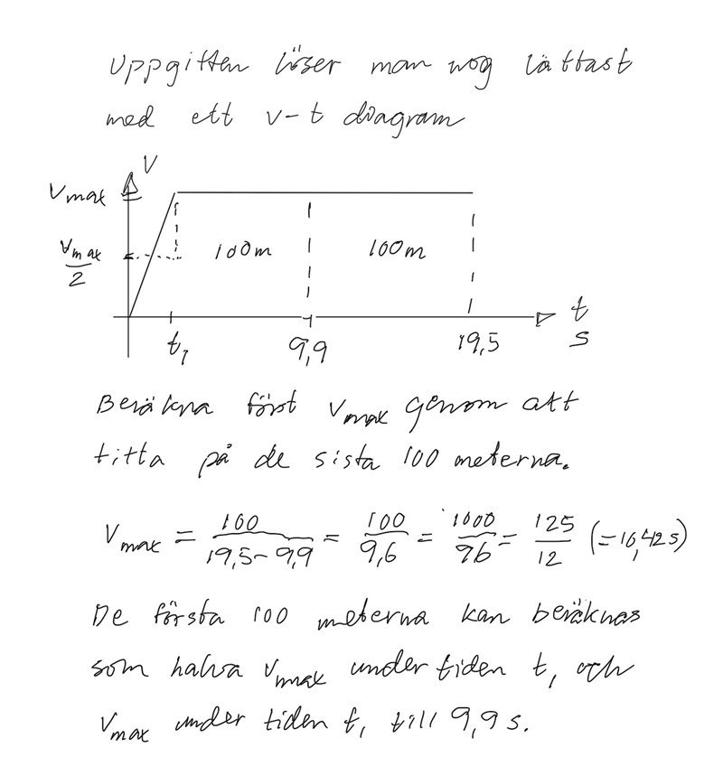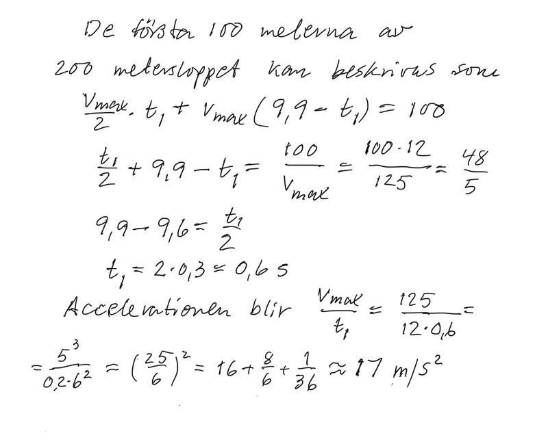 hej! Jag förstår verkligen inte denna fråga. Jag beräknar hastigheten i båda loppen och får 10.10 och 10.25 m/s. Sen sätter jag in den i s formeln s=v0*t+at^2/2 och får 1.02 m/s2 och 0.52m/s2. Jag förstår dock inte alls hur facit har gjort. Vart får dom 10.42 ifrån och hur har dom gjort en tabell när jag har olika värden på de olika loppen? Tacksam för all hjälp!