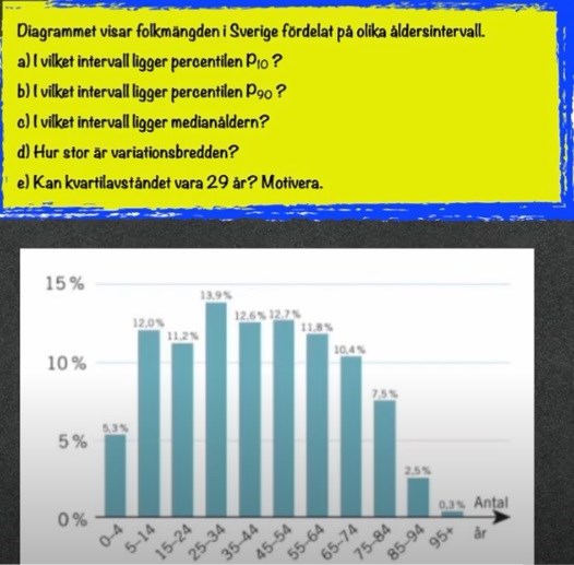 Den person som har tio procent av befolkningen yngre än hen, kan inte vara under 5, men måste vara under 15. Så 10-percentilen ligger i intervallet 5–14 år.