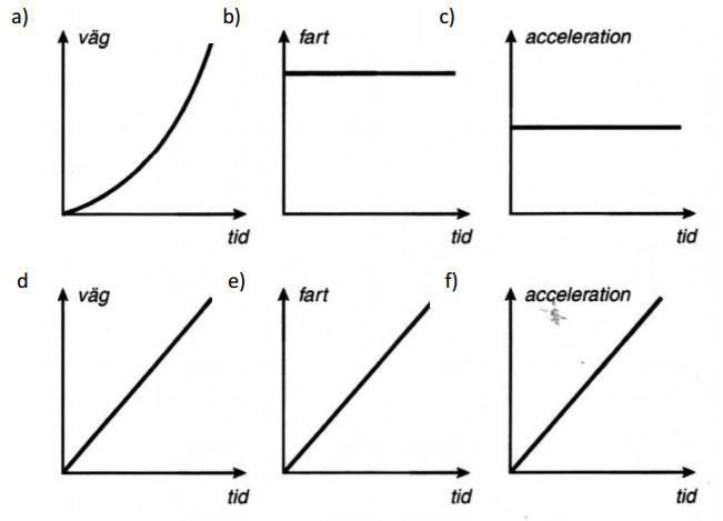 Prova att rita diagram själv. Tänk dig att du sitter i en bil som kör på en rak väg. Bilen kör exakt 70 km/h hela tiden. Hur ser kurvorna ut om du ritar tre olika diagram, ett med väg på y-axeln och tid på x-axeln, ett med fart på y-axeln och tid på x-axeln och ett med acceleration på y-axeln och tid på x-axeln?