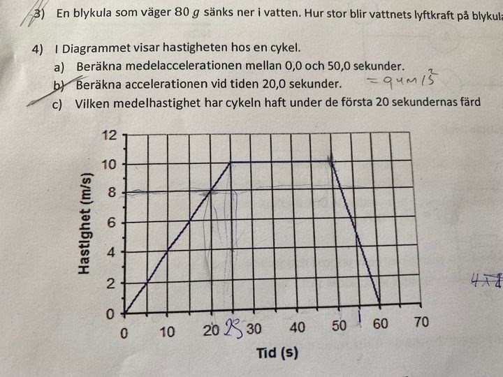 1) Eftersom accelerationen var konstant (0,4m/s2), du kan ta det aritmetiska medelvärdet: vmedel = (v(0) + v(20))/2 = (0+8)/2