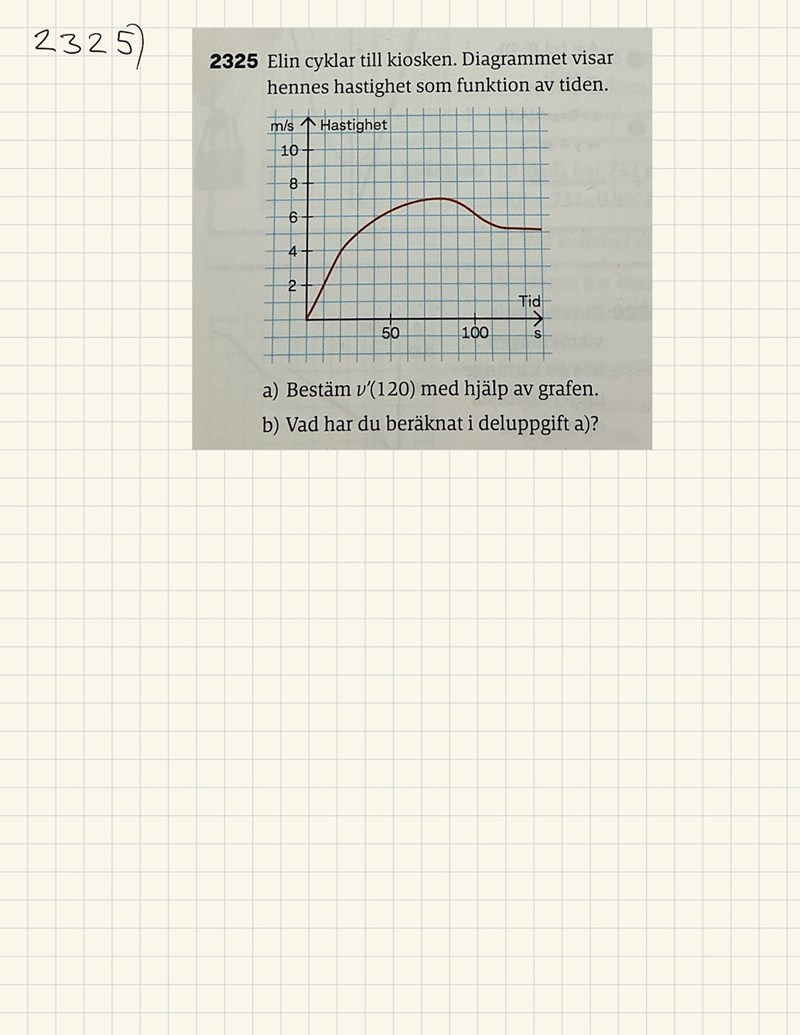Diagrammet visar hennes hastighet som en funktion av tiden. Bestäm v’(120)