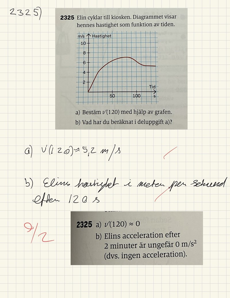 har lite svårt att tolka denna. Jag ser inget funktionsuttryck för v som indikerar att detta är grafen till just v. Det faktum att y i grafen som indikerar hastigheten m/s tolkar jag som att detta är derivatan över tid. Men menar de typ andraderivatan i det här fallet med v’(120) eller att v(t) är sträckan Elin färdats efter t sekunder?