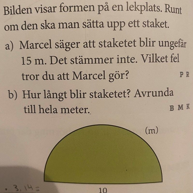 Staketet runt hela området består av 15,7 m staket i form av en halvcirkel (som du räknade ut) och 10 m staket längs diametern.