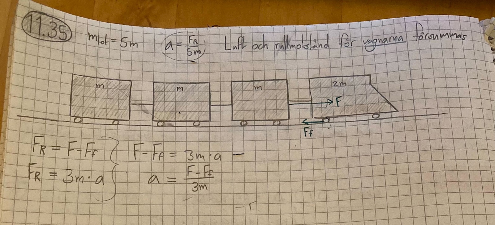 F, och varje vagn har massan m. Lokets hjul
