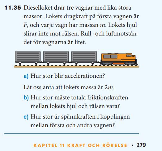 Friktionskraften på loket spelar ingen roll för kraften i kopplingen mellan loket och första vagnen (däremot behövs den i b-uppgiften). Du vet att kraften är F och massan för de tre vagnarna är 3m sammanlagt, så accelerationen är ...