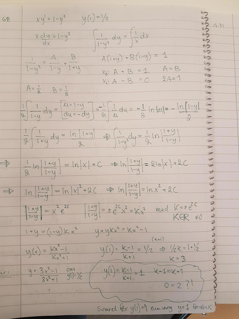 En delfråga i uppgiften är om det finns en lösning med y(1)=1. när jag sätter in det i ekv för att lösa ut K får jag 0=2 vilket jag tycker tyder på att lösning saknas, men lösningen är y=1 för alla x. Det borde vara något jag inte förstår. Är det någon som har en aning eller kan förklara?