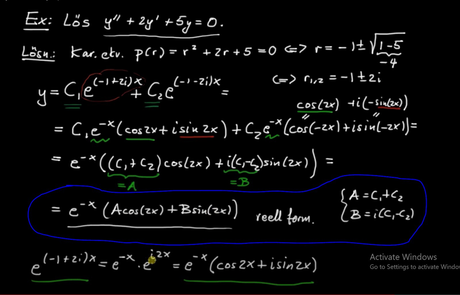 I den blåmarkerat områdena beskrivs hur man räknar ut konstanterna A och B i formeln. Men om A=C1+C2 och B=i(C1-C2) betyder det att A eller B kan vara komplexa tal?