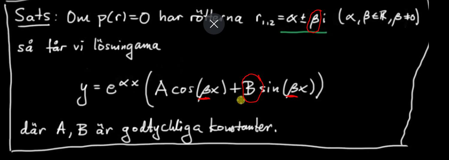 B i rötterna r1,2=a±Bi Motsvarar detta B i cos(Bx) och sin(Bx) eller konstanten B framför sin(Bx)