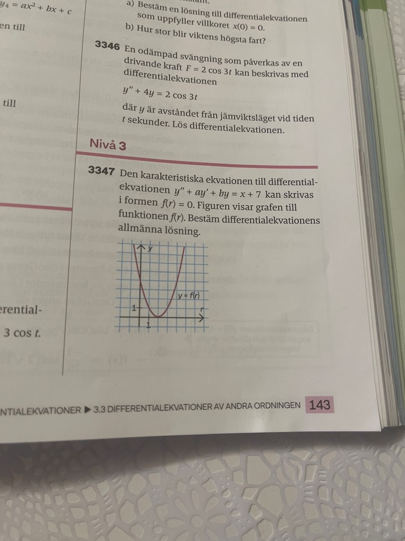 I uppgiften fås det att den karakteristiska ekvationen till differentialekvationen kan skrivas f(r) med f(r) som grafen. Med andra ord så genom att finna funktionen ti.ll grafen så har man fått fram den karakteristiska ekvationen. Det gäller att vilket fås av skärningen med r-axeln. I uppgiften gavs att den karakteristiska ekvationen är f(r)=0 och med f(r) ovan fås då den karakteristiska ekvationen till