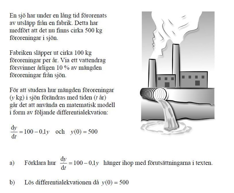 Du verkar inte ha tagit fram någon partikulärlösning, utan använder bara den homogena lösningen. Du räknar alltså på situationen att det inte tillförs några nya föroreningar till sjön. I så fall är det helt rätt att konstanten är +500.