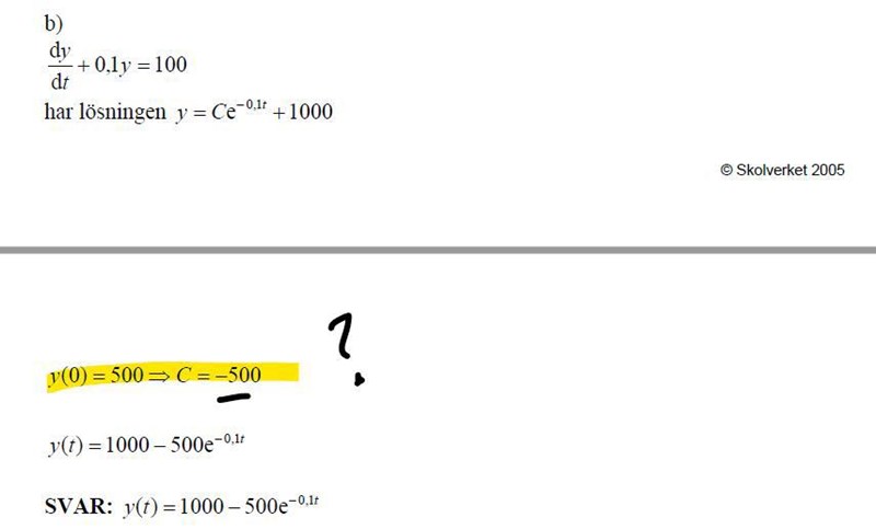 Jo jag har räknat fram att yp = 1000, alltså är y = yh + yp = 500 * e-0,1x + 1000. Facit har kommit fram till samma lösning förutom att det finns ett minustecken framför 500, och jag förstår inte varför. Hur jag har beräknat yh framgår i inlägget ovan.