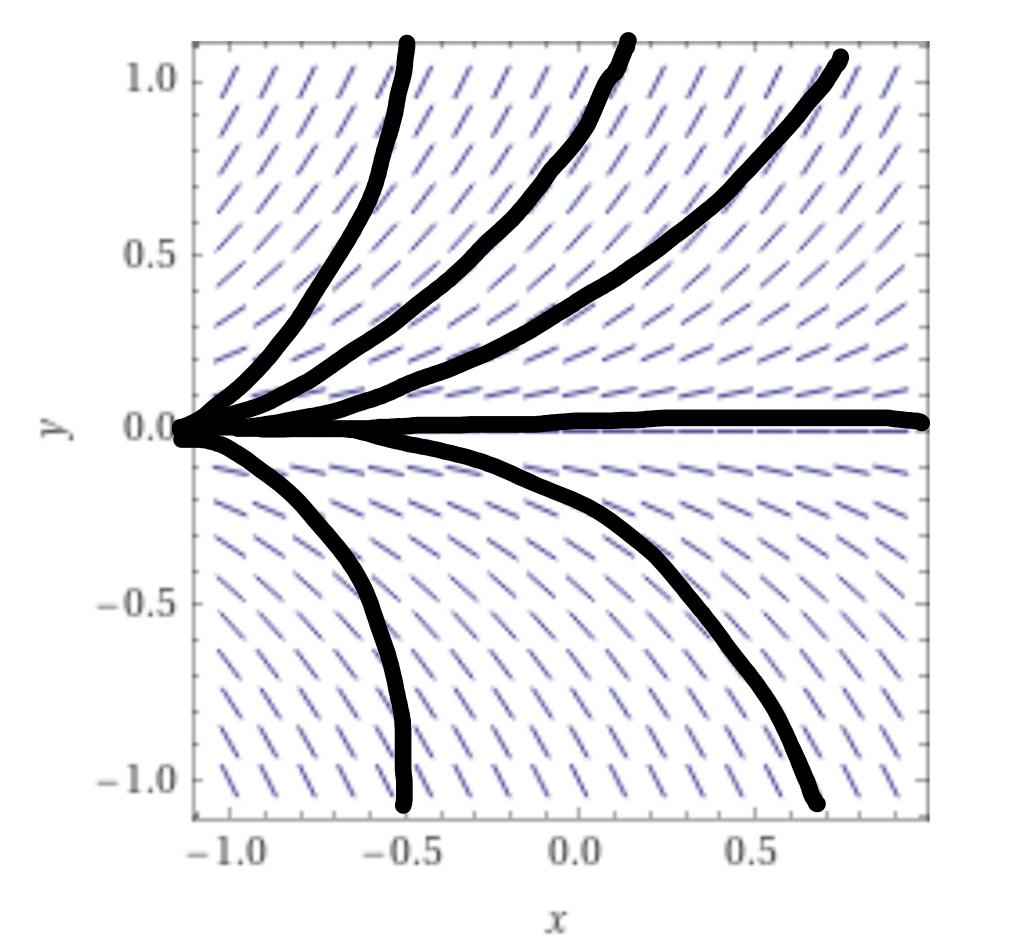 Tack! Men jag är fortfarande nybörjare i differentialekvationer och försöker förstå det mest basala. Man skriver i min lärobok att y´=2y och så har de ritat ett riktningsfält där man tex kan se att när y=1 så lutar tangenterna med k=2. Detta är inte svårt att förstå. Men så skriver de att just denna ekvation kan lösas exakt: . Det jag inte förstår är att om jag är fri att välja så kan jag ju få vilket värde som helt. Menar man att om man tex sätter x=7347 och hittar ett C så att , så har man hittat en lösningskurva?