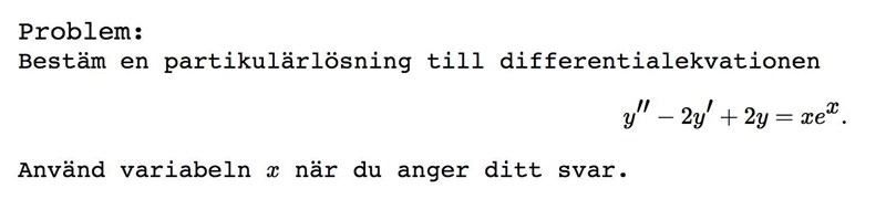 Nu är jag lat (läs: har lite bråttom), och har bara löst partikulärlösningen, men den är följande:
