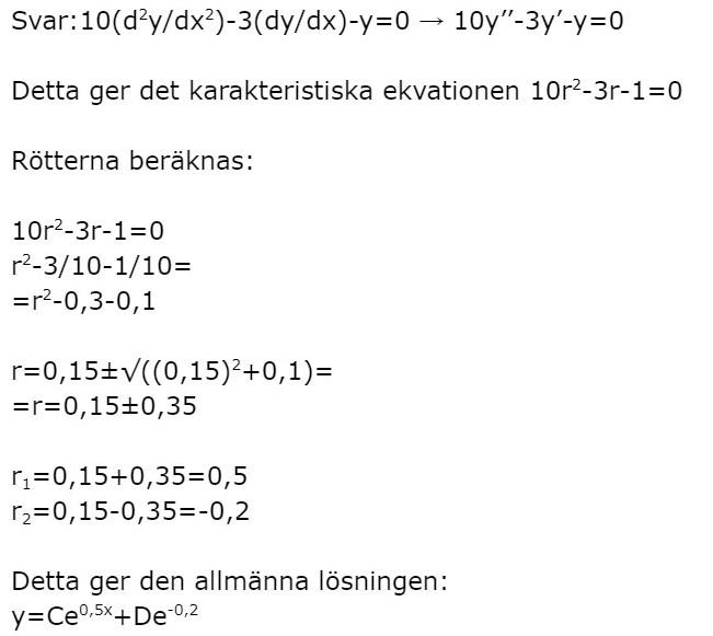Den karakteristiska elva är: r2 -0,3r-0,1=0 Kvadratkomplettering i VL: r2 -0,3r+0,152 —0,152 -0,1=(r-0,15)2 - 0,0225-0,1=0 <=>. (r-0,15)2 =0,1225=0,352 <=> r=0,15 +- 0,,35 <=> r= 0,5 eller r=-0,2 Därefter som du skriver.