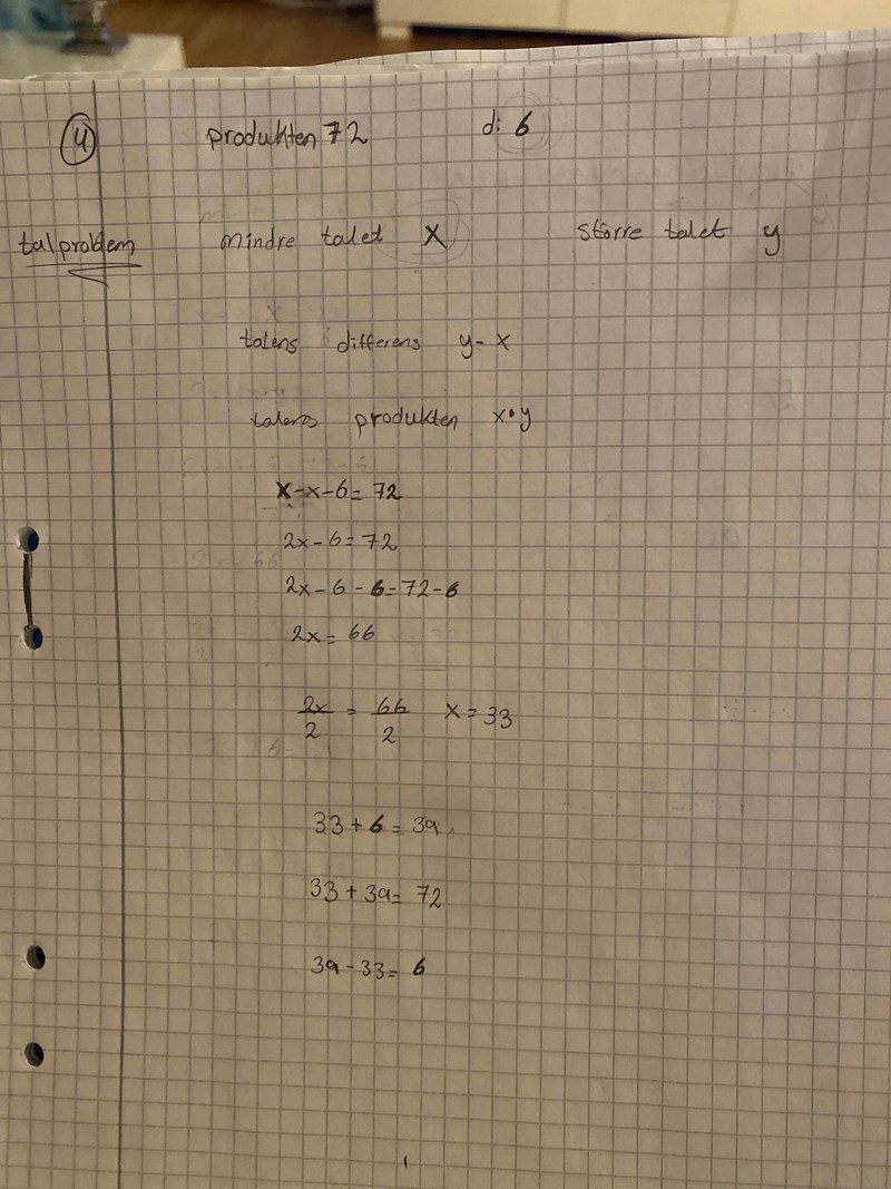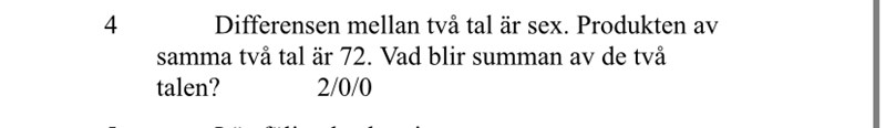 Du har förvisso hittat två tal vars produkt är 72 (9*8=72), men uppgiften sa att differensen mellan de två talen skulle vara 6. Hur stor är differensen mellan talen 8 och 9?