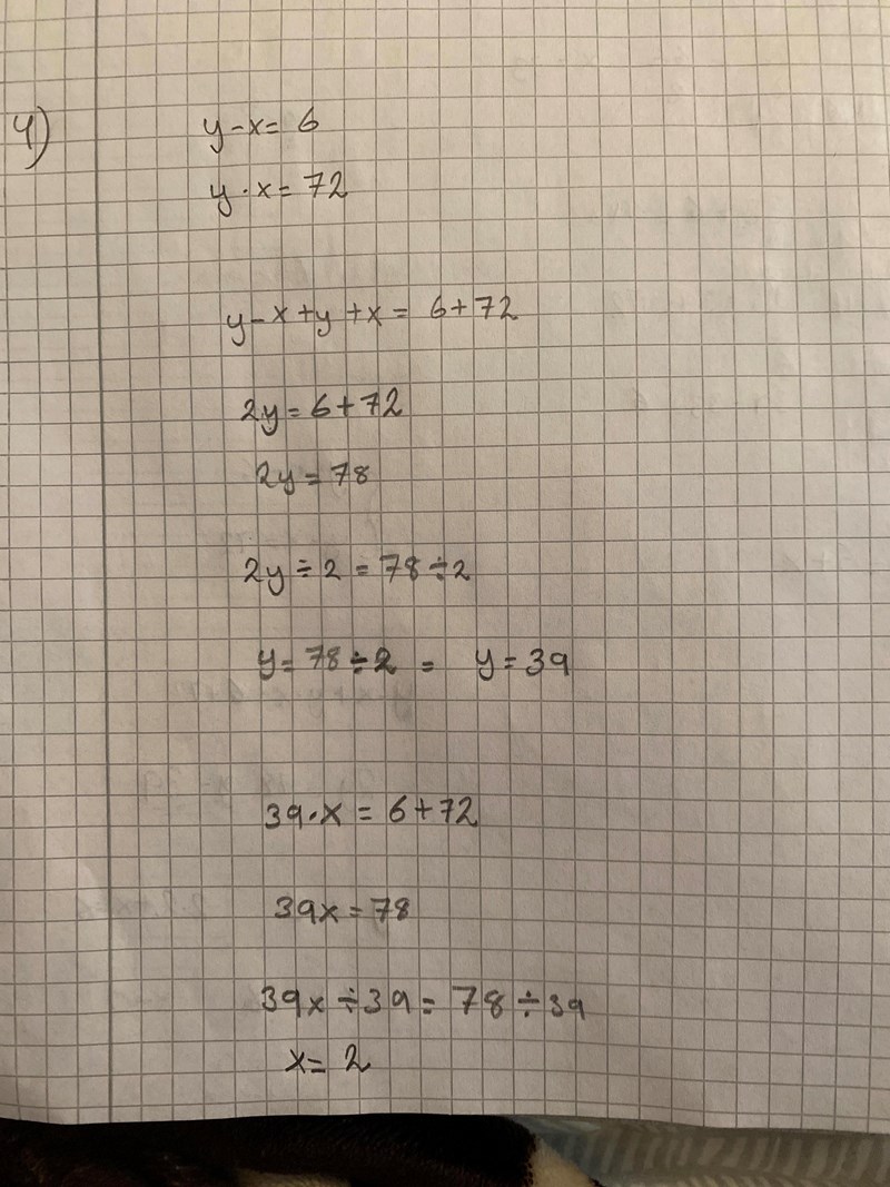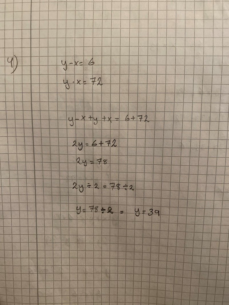 Om det nu hade stått y-x+y+x=6+72y - x + y+x = 6+72, så skulle ditt nästa steg vara rätt, men det står det inte.