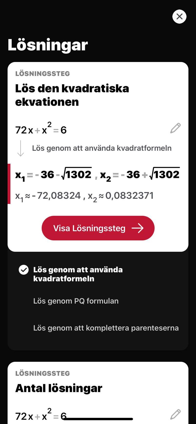 Ja nu blev det rätt. Bra. Gjorde du 6x + x-72 = 0 och sen tog PQ formeln för att få ut x1 och x?