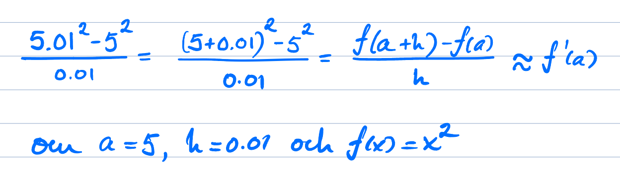 Man kan misstänka att 2.001 är (a+h). Det är ju "strax över ett annat värde", i det här fallet 0.001 över 2. På samma sätt ser vi att 1.999 är "strax under ett annat värde".