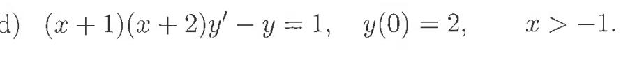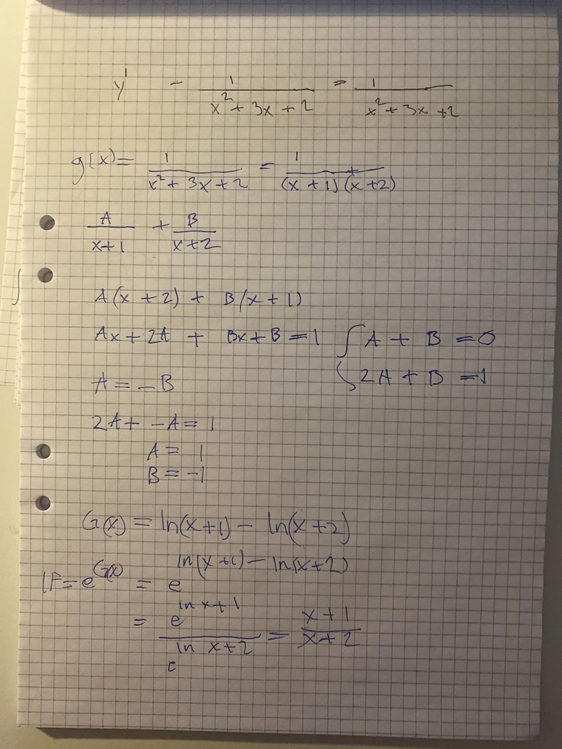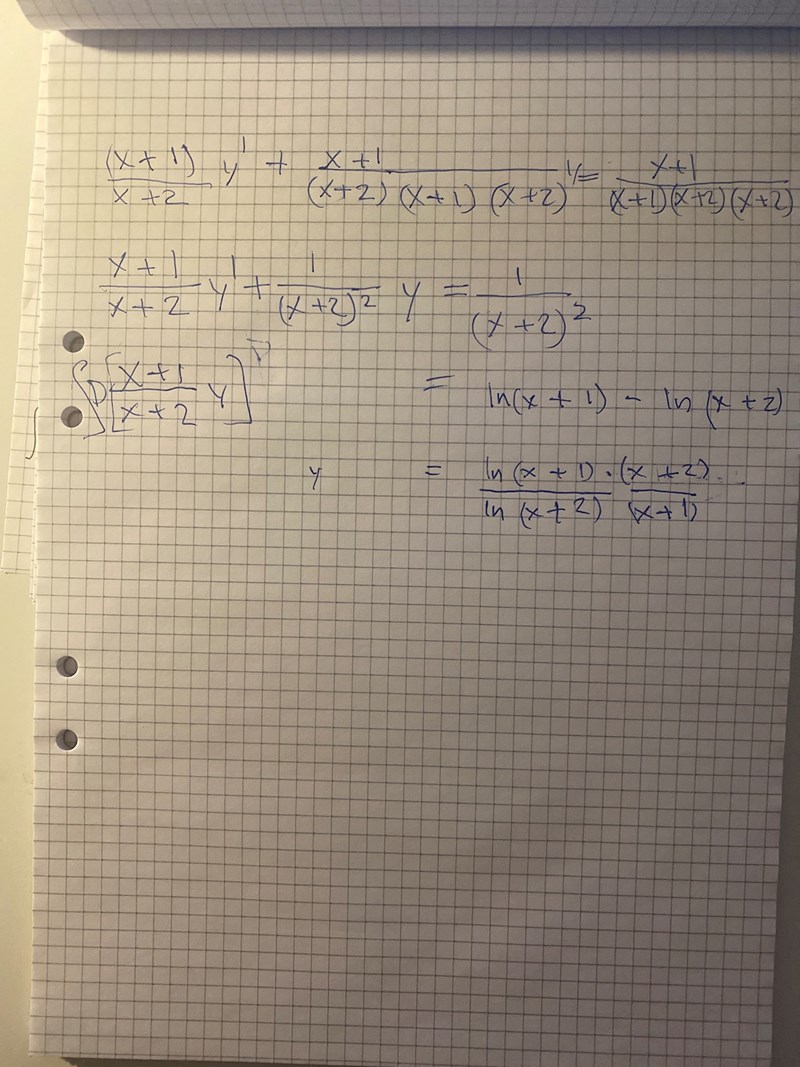 Jag har först att lösa om uppgiften igen och får jag att y= -4 / ((x+2)(x+1)) + 5(x+2) / 4(x+1) och jag vill så 5x+4 / x+2 som är rätt svar. Här nedan är mitt nya lösningsförlag (upptäckte ett tecken fel som jag rättade till i detta lösingsförslag, hade missat att då jag räknar ut den pariella integranden får jag A/(x+1) + B/(x+2) = -1 och inte =1). Men i och med att jag inte får rätt svar så antar jag att de fortsatt är något fel som jag göra.