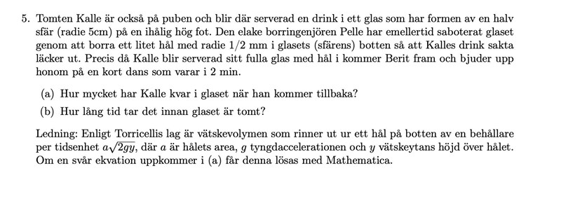 Om du följer ledningen och säger att y är höjden över hålet, kan du komma på ett uttryck för totala vätskevolymen V(y)? Kan du sedan använda det faktum att du vet hur mycket volym som läcker ut per tidsenhet?