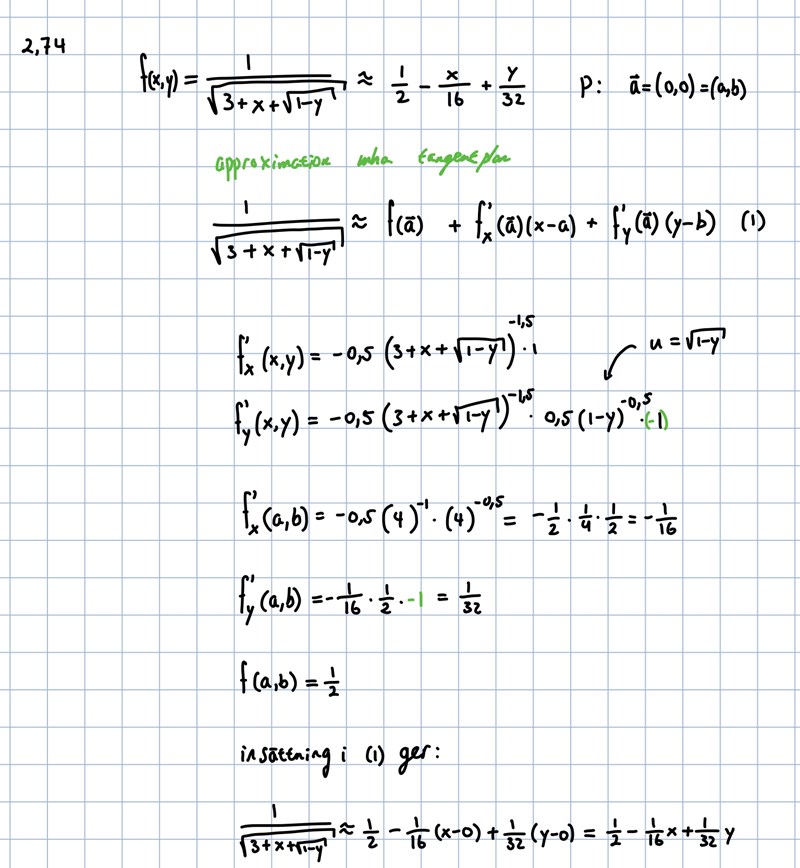 Idén är att beräkna funktionsvärdet och derivatornas värden i origo. Sen använder man dessa för att ungefärligt kunna beräkna funktionsvärden nära origo. Det motsvarar fallet i en variabel där du har en kurva, tangeringspunkt och tangent, och så går du en liten bit längs tangenten för att ungefärligt beräkna kurvans värde i närheten av tangeringspunkten.
