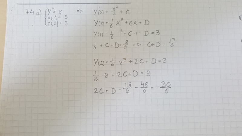 Du har fått fram två ekvationer med två obekanta. Lös ut C och D så är du nästan framme.