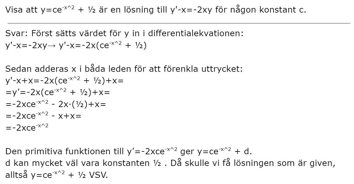 En annan (och enklare?) metod är att derivera y, sätta in y och y' i diffekvationen och visa att den stämmer.