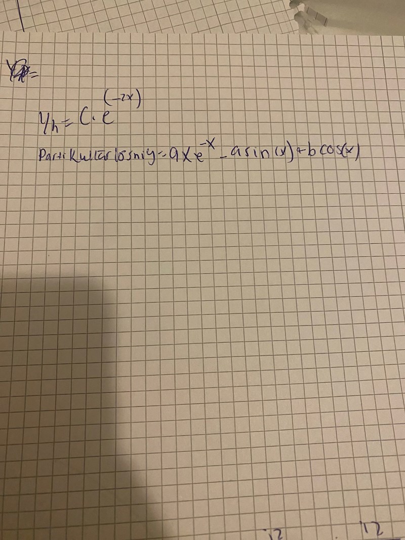 Sen ska du gissa en partikulärlösning, då får man titta på hur högerledet ser ut: Där ser vi en exponentialfunktion och en sinus, Då kan man anta att partikulärlösningen också innehåller det, lägg på några konstanter och försök lösa ut dom. Det är klokt att ta med både en sinus och cosinus i gissningen.