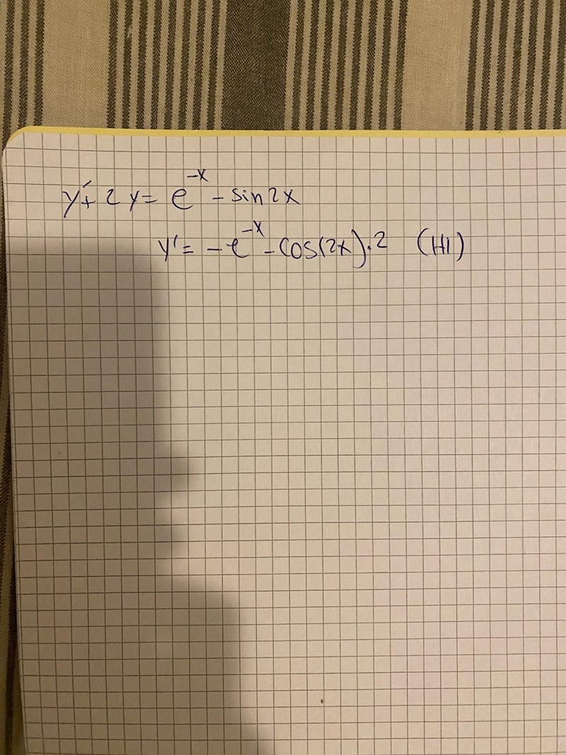ddx(D*e-x+Asin(2x)+Bcos(2x)) + 2(D*e-x+Asin(2x)+Bcos(2x)) =e-x-sin(2x)