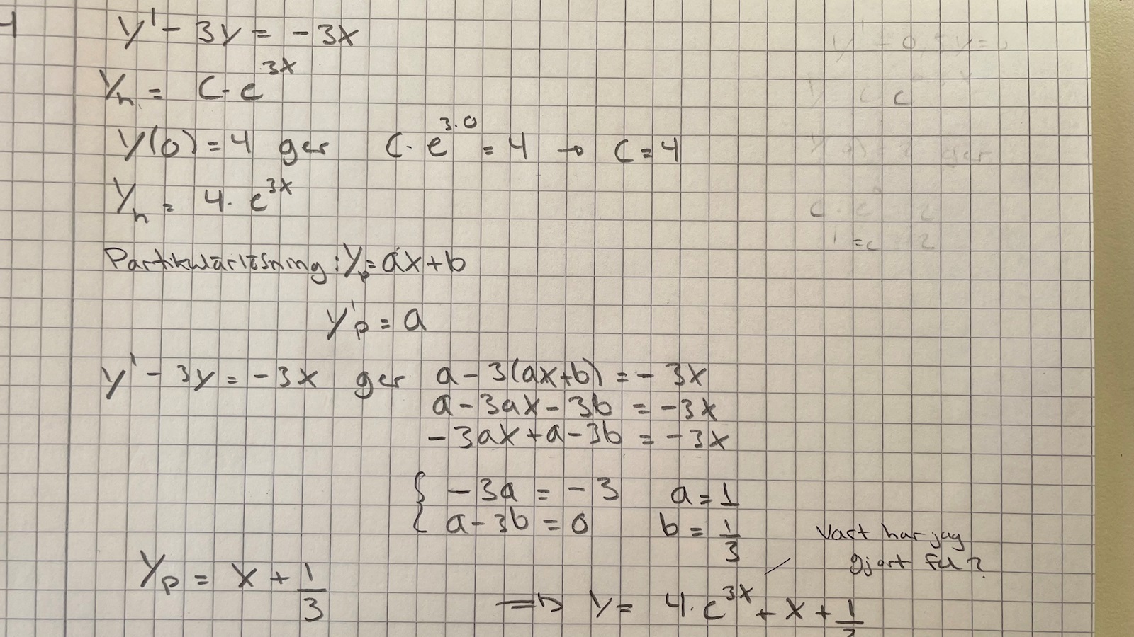 Din homogena lösning ger yh(0) = 4, men sedan är ju yp(0) = 1/3.