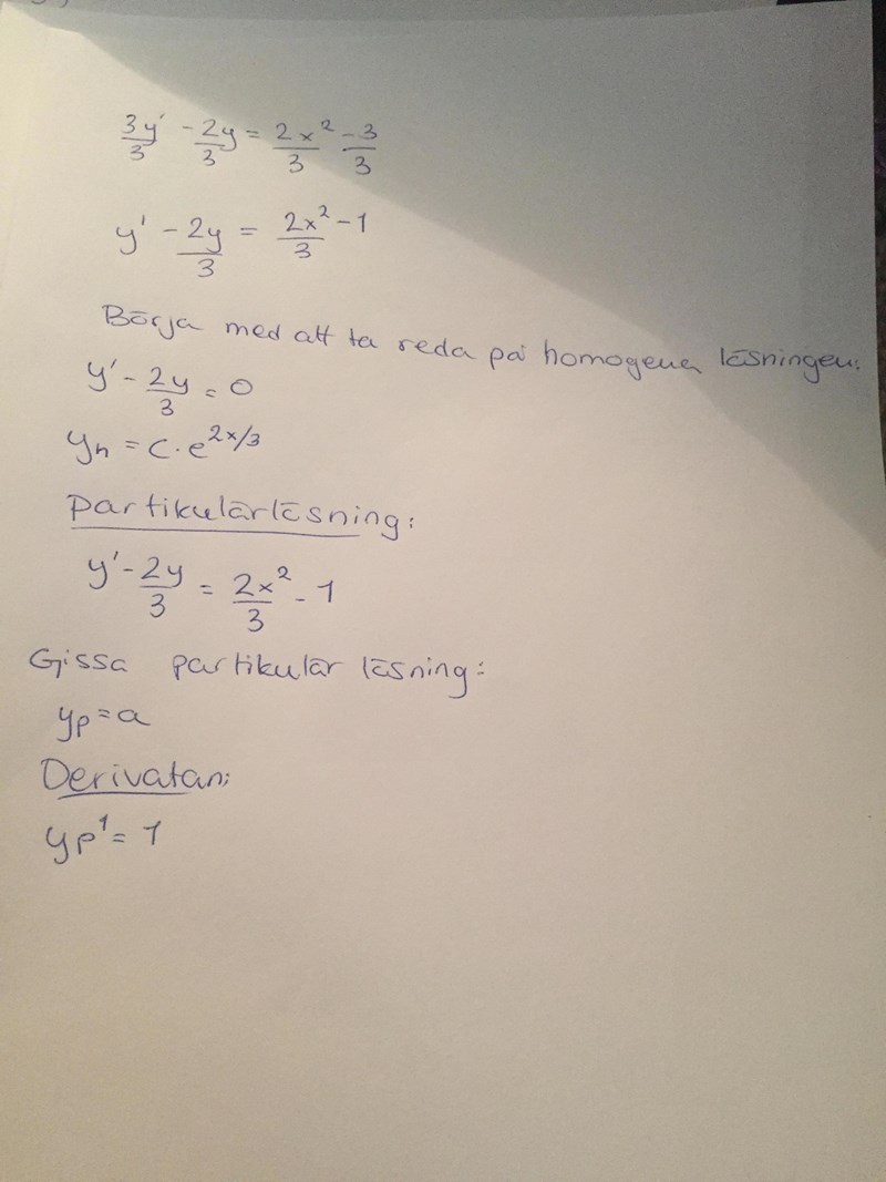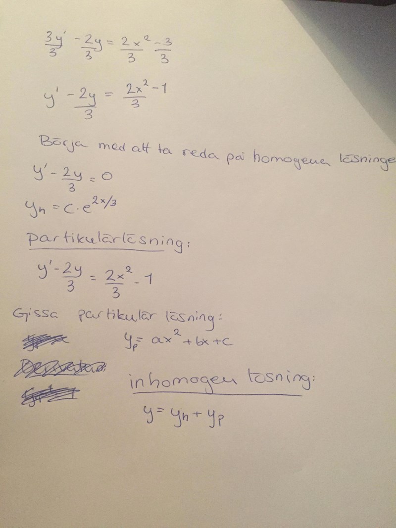 Nu ser jag att du har delat diffekvationen med 3 och satt in y och y'. Det är att krångla till det i onödan. Men om vi skall titta på dina krångliga siffror, kan vi se att koefficienten för -termen skall vara lika i VL och HL, d v s , så a = -1. Gör på motsvarande sätt för att ta fram b och c också.