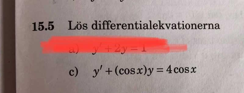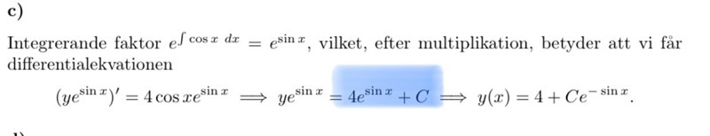 det är ett steg jag inte hänger med på här, jag har markerat det med blått. Egentligen är det integrationen jag inte lyckas lösa. 4cosxesinx dxHur löser jag denna? Jag får ett långt uttryck med både sinus och cosinus.