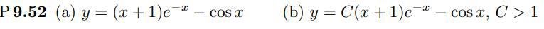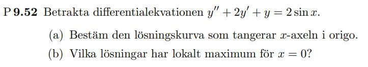 Har deriverat den allmänna lösningen y=(C1+C2x)e-x-cosx och där har jag fått y'(x)=-e-x(C1-C2+C2x)+sinx, y'(0)=C1-C2 dvs C1=C2 för x=0, vilket gett y=C(x+1)e-x -cosx. y(0)=C-1 dvs C=1 Så långt är jag med. Förstår dock inte varför C>1?