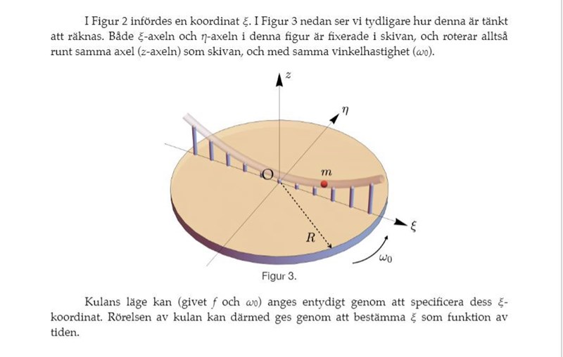 Lägesvektor bör väl isåfall vara r(t) = ξ (cosωt, sinωt, 0) + η(-sinωt, cosωt, 0) + z(0, 0, f(ξ))? man får fram hur mycket skivan vridits + att man ser vart kulan befinner sig höhdmässigt. Isåfall är väl v(t) = r'(t) och a(t) = v'(t) om jag förstår korrekt?