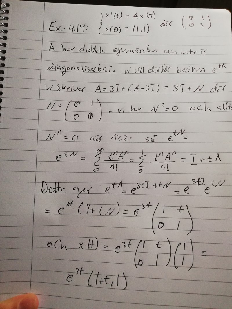 3) denna metoden används när matrisen inte är diagonaliserbar, men jag förstår inte helt hur vi ska komma till förmelen, 3I+(A-3I), eller mer exakt hur vi ska komma till att det är 3 som identitesmatrisen ska multipliceras med.